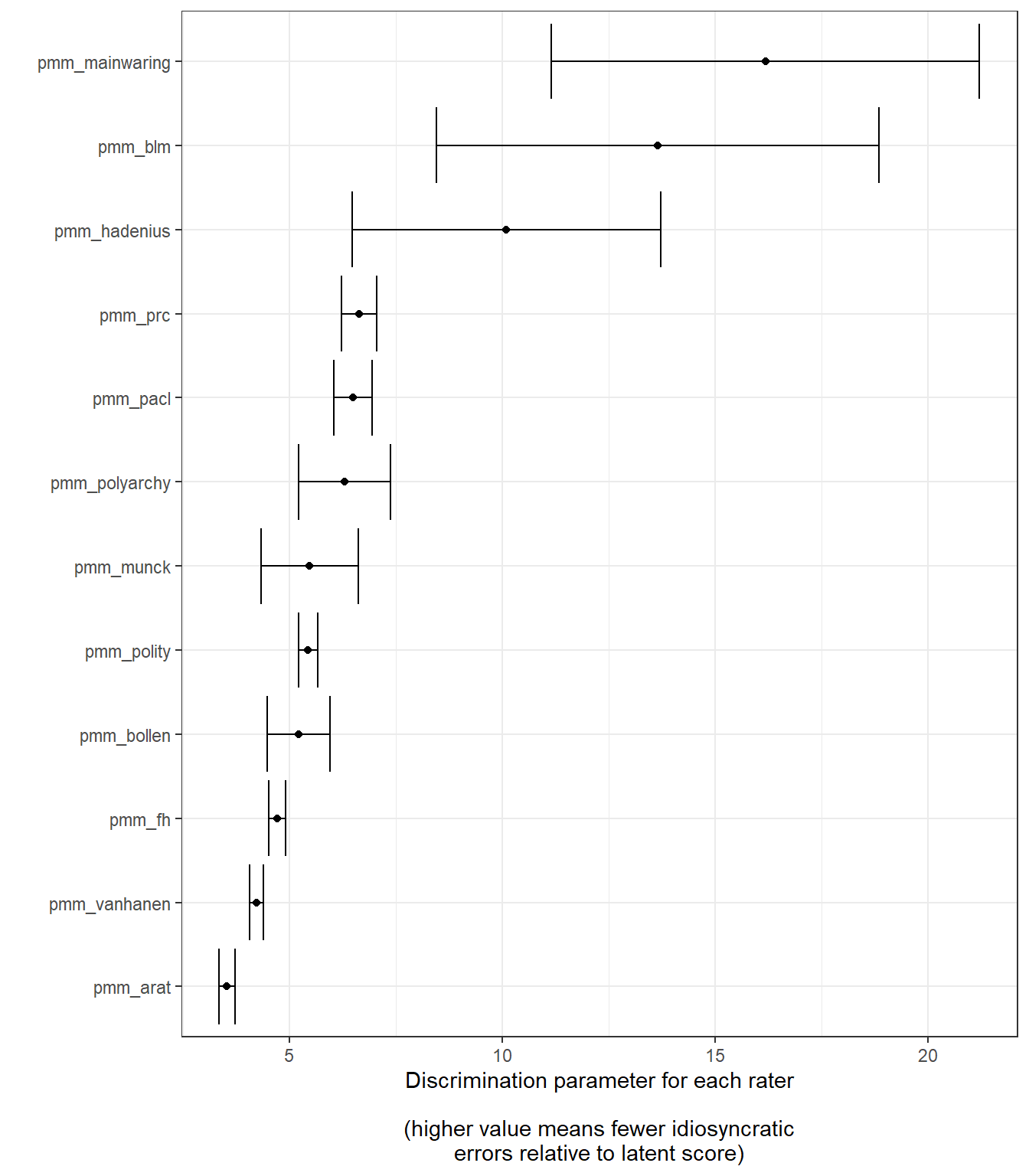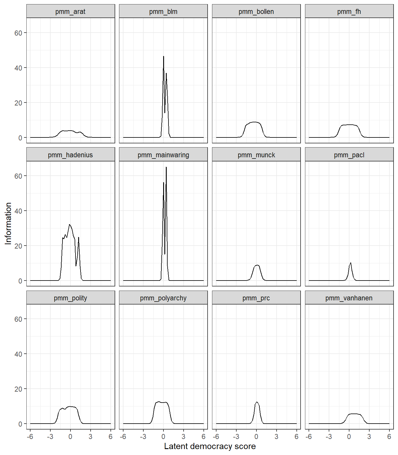 In order to replicate the original UD scores, we need to use PMM’s replication dataset (Pemstein, Meserve, and Melton 2013). This dataset is included this package: we just need to generate a data frame of democracy scores from all the datasets with names ending in _pmm. We can then use the function prepare_democracy_data() to put the data in the right format for use with mirt.